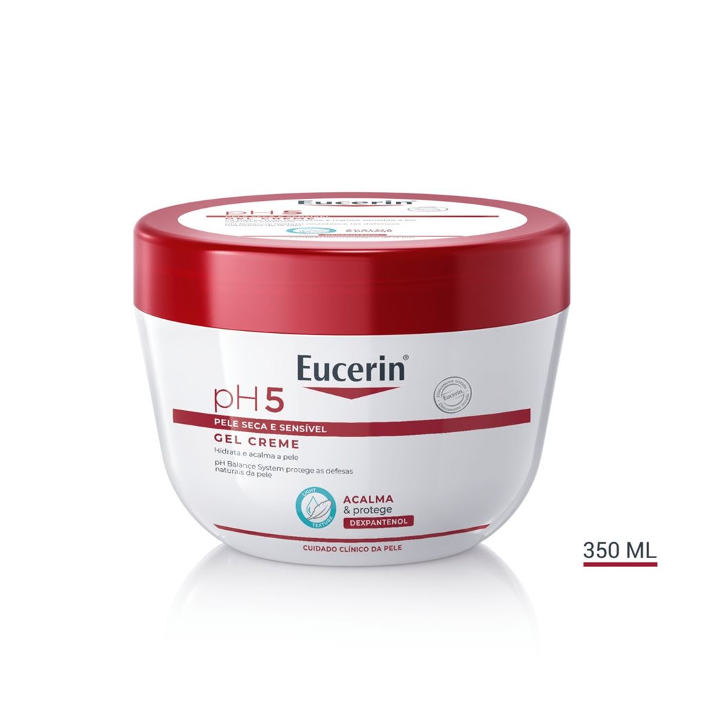 Tanto a loção pH5 como o pH5 Gel Creme são formulados para hidratar, proteger e acalmar a pele sensível. Eucerin pH5 Gel-Creme tem uma textura ultraleve, 0% gordurosa, de rápida absorção, sem deixar resíduos.