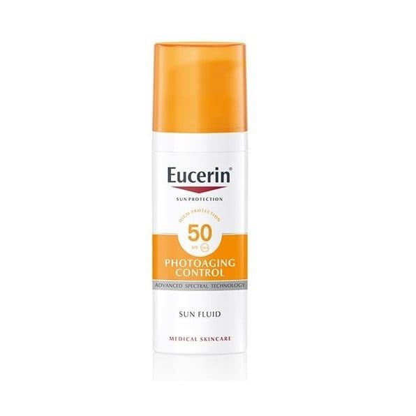 Eucerin Sun Fluid Anto-Age SPF 50 tem uma textura agradável e leve, tem uma absorção rápida e deixa um aspecto matificante.