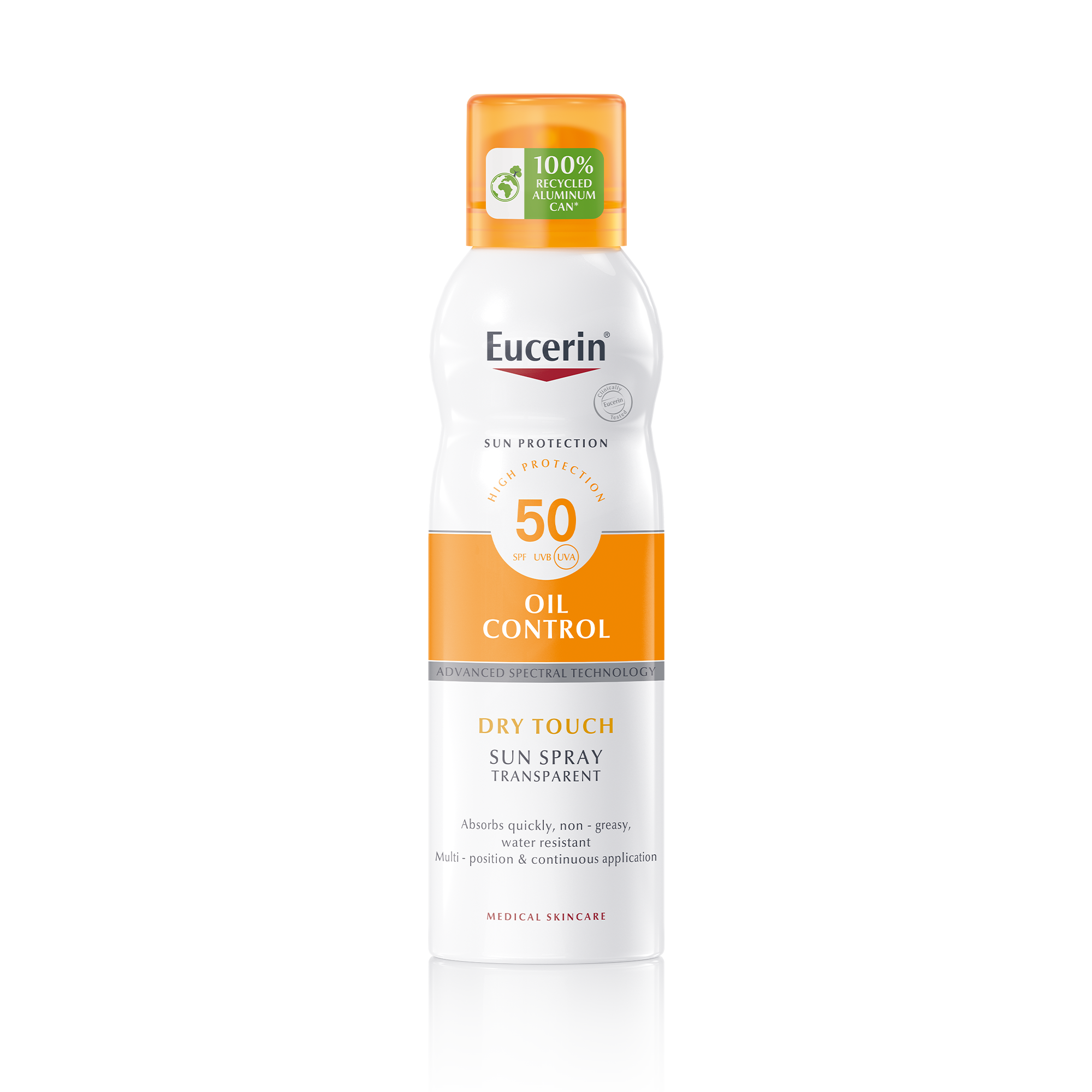 Eucerin Spray Solar Transparente Toque Seco FPS 50 é à prova de água, não gorduroso e não pegajoso.